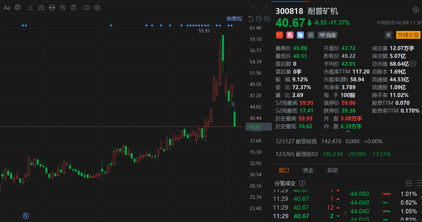 每经记者|彭斐 每经编辑|金冥羽 陈旭 2月4日,耐普矿机(SZ300818)股价大跌超16%。 | 耐普矿机 | | | --- | --- | | 300818 @ L1 | | | 41.19 | 高 45.00 市值69.52亿 量比 4.62 | | 保 | 40.76 流通45.10亿 换 9.29% | | -8.03 -16.31% + | 43.72 市盈 118.78 额 4.29亿 | | 耐普转02 190.154 -11.28% 溢价率 77.46% | | | 异动解读:终止海外投资+转债异常波动 ... × | | | 分时 | 日K 周K 月K 五日 更多 ** | | 均价:42.21 最新:41.19 -8.03 -16.31% | | | 57.68 | +17.19% 大单 41.41 *.66万 | | | 卖5 41.30 45.8万 | | -49.22- | 54 41.29 1.24万 -0.00% 室2 | | 重3 | 41.28 2.48万 | | | 41.20 117万 | | 卖1 | 41.19 2.06万 | | 21 | 41.13 1.65 ...
