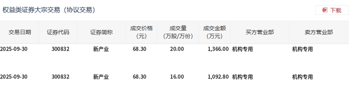 Group 1 - On September 30, a total of 360,000 shares of New Industry were traded in block transactions, with a transaction value of 24.588 million yuan, accounting for 11.12% of the total transaction value for the day [1] - The transaction price was 68.3 yuan, which remained stable compared to the market closing price of 68.3 yuan [1] - The block transactions included two separate trades, one for 200,000 shares valued at 13.66 million yuan and another for 160,000 shares valued at 10.928 million yuan, both executed by institutional investors [2]