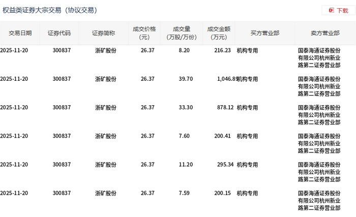 Summary of Key Points Core Viewpoint - On November 20, Zhejiang Mining Co., Ltd. executed a block trade of 1,075,900 shares, amounting to 28.37 million yuan, which accounted for 13.62% of the total trading volume for the day. The transaction price was 26.37 yuan, representing an 11.21% discount compared to the market closing price of 29.7 yuan [1]. Group 1: Trading Details - The block trade involved multiple transactions with a total volume of 107.59 million shares and a total value of 28.37 million yuan [1]. - The transaction price of 26.37 yuan was significantly lower than the market closing price, indicating a notable discount of 11.21% [1]. - The trading activity was primarily conducted by institutional investors, with various brokerage firms involved in the buying and selling process [2].