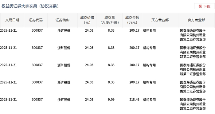 Core Insights - Zhejiang Mining Co., Ltd. executed a block trade of 424,100 shares on November 21, with a transaction value of 10.19 million yuan, representing 5.85% of the total trading volume for the day [1] - The transaction price was 24.03 yuan, which is a 10% discount compared to the market closing price of 26.7 yuan [1] Summary by Category Trading Activity - A total of 424,100 shares of Zhejiang Mining were traded in a block transaction on November 21 [1] - The transaction accounted for 5.85% of the total trading volume on that day [1] Pricing Information - The block trade was executed at a price of 24.03 yuan per share [1] - This price reflects a 10% discount from the market closing price of 26.7 yuan [1] Institutional Participation - The block trade involved institutional investors, with specific details on the selling and buying brokerage firms [2]