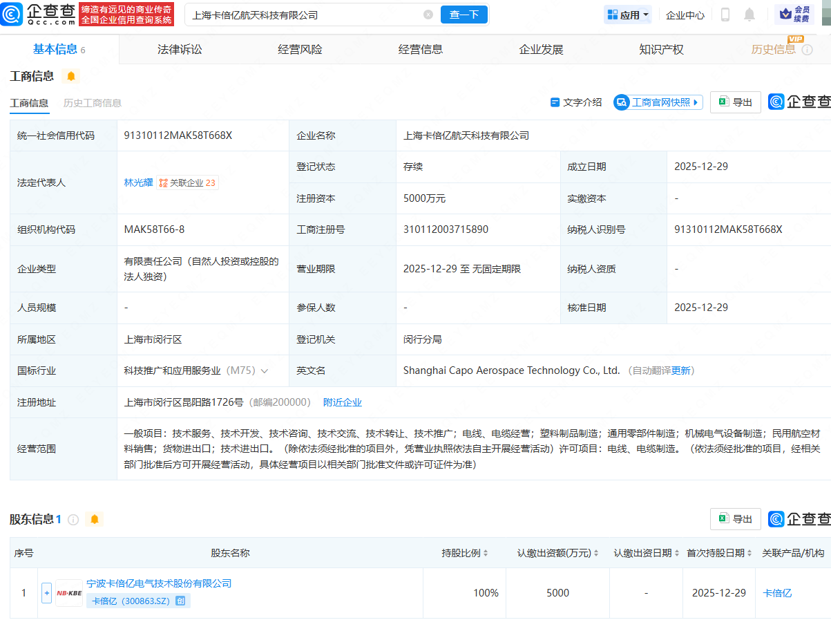 企查查APP显示,近日,上海卡倍亿航天科技有限公司成立,法定代表人为林光耀,注册资本为5000万元,经营范围包含:电线、电缆经营;塑料制品制 造;通用零部件制造;机械电气设备制造;民用航空材料销售等。企查查股权穿透显示,该公司由卡倍亿(300863)全资持股。 | 合 缔造有江以的商业传言 | 上海卡倍亿航天科技有限公司 辛国ひ亦信用臺洵至 | | 8 查一下 | ー 应用 ▼ | | 企业中心 0 0 | | --- | --- | --- | --- | --- | --- | --- | | 基本信息 6 | 法律诉讼 | 经营风险 | 经营信息 | 企业发展 | 知识产权 | F | | 工商信息 ● | | | | | | | | 工商信息 历史工商信息 | | | | 目 文字介绍 | 【G 工商官网快照▶ | 전 음出 | | 统一社会信用代码 | 91310112MAK58T668X | 企业名称 | 上海卡倍亿航天科技有限公司 | | | | | 法定代表人 | 林光耀 探关联企业 23 | 登记状态 | 存续 | 成立日期 | | 2025-12-29 | | | | 注册资本 | 500 ...