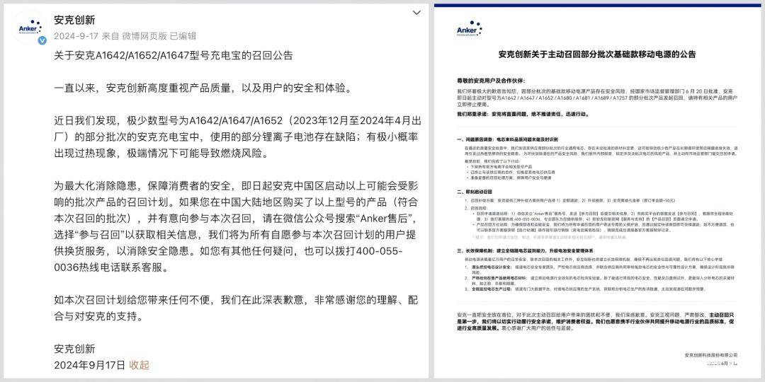 文 | 萧田 过去一年半,安克创新在全球主要市场掀起了一场罕见的"召回风暴":6月,安克在美国召回115万台移动电源,9月,安克在美国召回48万个移动电源, 时隔一个月,安克又在日本大规模召回产品。 | 安克创新 | | | --- | --- | | 2024-9-17 来自 微博网页版 已编辑 | | | 关于安克A1642/A1652/A1647型号充电宝的召回公告 | | | 一直以来,安克创新高度重视产品质量,以及用户的安全和体验。 | 00. 用于分析发展的技术的重要实验的重要发展的全面的。 参加发展的技术的管理的同学 2 / 4 1642 / A 1647 / A 1652 / A 1680 / A 1681 / A 1689 / A 1757 P 間 分散 交差 / 2 / 2 / 8 | | 近日我们发现,极少数型号为A1642/A1647/A1652(2023年12月至2024年4月出 | | | 厂)的部分批次的安克充电宝中,使用的部分锂离子电池存在缺陷;有极小概率 | | | 出现过热现象,极端情况下可能导致燃烧风险。 | | | 为最大化消除隐患,保障消费者的安全,即日起安克中国区启 ...