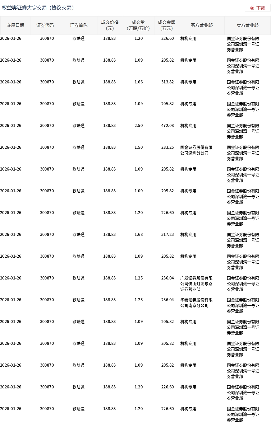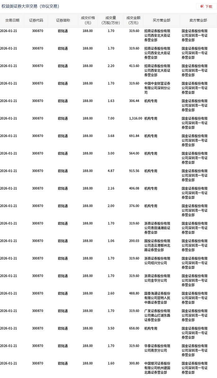 | 交易日期 | 证券代码 | 证券简称 | 成交价格 | 成交量 | 成交金额 | 买方营业部 | 卖方营业部 | | --- | --- | --- | --- | --- | --- | --- | --- | | | | | (元) | (万股/万份) | (万元) | | | | 2026-01-21 | 300870 | 欧陆通 | 188.00 | 1.70 | 319.60 | 招商证券股份有限 | 国金证券股份有限 | | | | | | | | 公司西安北大街证 | 公司深圳湾一号证 | | | | | | | | 券营业部 | 芽营业部 | | 2026-01-21 | 300870 | 欧陆通 | 188.00 | 1.70 | 319.60 | 招商证券股份有限 | 国金证券股份有限 | | | | | | | | 公司西安北大街证 | 公司深圳湾一号证 | | | | | | | | 送量不能 | 券营业部 | | 2026-01-21 | 300870 | 欧陆通 | 188.00 | 2.20 | 413.60 | 招商证券股份有限 | 国金证券股份有限 | | | | | | ...