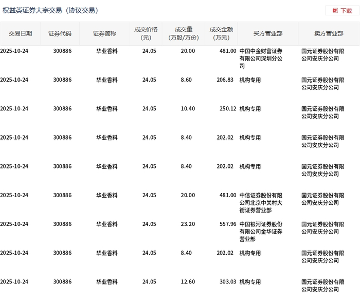 Core Insights - On October 24, Huaye Spice executed a block trade of 1.2 million shares, amounting to 28.86 million yuan, which accounted for 34.95% of the total trading volume for the day. The transaction price was 24.05 yuan, representing a discount of 17.01% compared to the market closing price of 28.98 yuan [1]. Trading Details - The block trade involved multiple transactions at a price of 24.05 yuan per share, with a total volume of 120,000 shares [2]. - The largest buyer was China Zhongjin Wealth Securities, which purchased 481,000 shares, while the seller was Guoyuan Securities [2]. - Other notable transactions included purchases by institutional investors, with varying volumes and amounts, indicating significant interest in the stock at the discounted price [2].