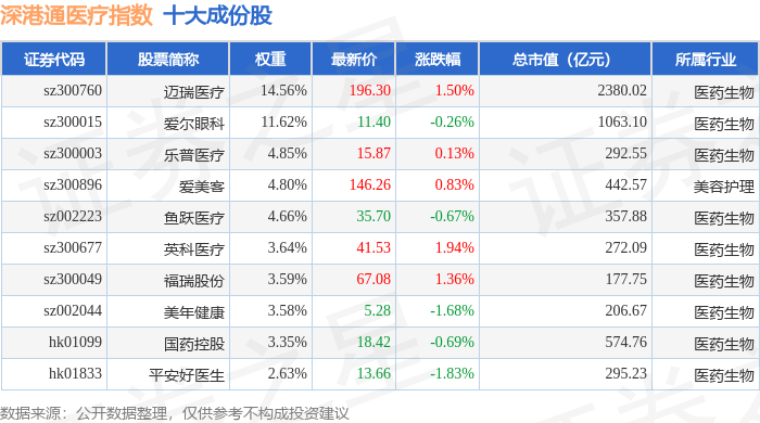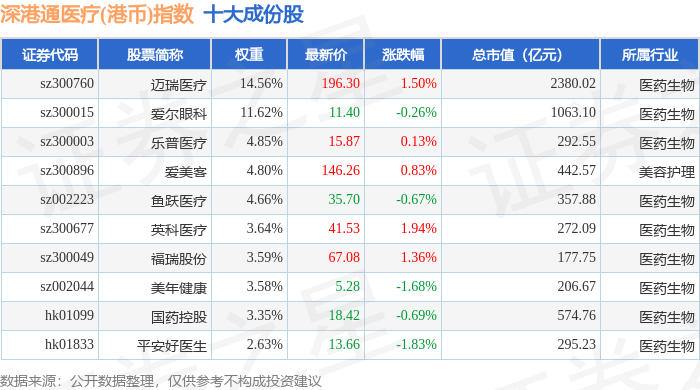 证券之星消息,11月27日,深港通医疗(港币)(983036)指数报收于4391.58点,涨0.14%,成交82.59亿 元,换手率0.75%。当日该指数成份股中,上涨的有32家,医脉通以3.65%的涨幅领涨,下跌的有24家, 健康之路以3.41%的跌幅领跌。 深港通医疗(港币)(983036)指数十大成份股详情如下: | 深港通医疗(港币)指数 十大成份股 | | --- | | 证券代码 | 股票简称 | 权重 | 最新价 | 涨跌幅 | 总市值(亿元) | 所属行业 | | --- | --- | --- | --- | --- | --- | --- | | sz300760 | 迈瑞医疗 | 14.56% | 196.30 | 1.50% | 2380.02 | 医药生物 | | sz300015 | 爰尔眼科 | 11.62% | 11.40 | -0.26% | 1063.10 | 医药生物 | | sz300003 | 乐晋医疗 | 4.85% | 15.87 | 0.13% | 292.55 | 医药生物 | | sz300896 | 爱美客 | 4.80% | 146.26 | 0.83% ...