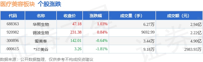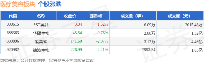 证券之星消息,1月22日医疗美容板块较上一交易日下跌1.35%,锦波生物领跌。当日上证指数报收于 4122.58,上涨0.14%。深证成指报收于14327.05,上涨0.5%。医疗美容板块个股涨跌见下表: | 代码 | 名称 | 收盘价 | 涨跌幅 | 成交量(手) | 成交额(元) | | --- | --- | --- | --- | --- | --- | | 000615 | *ST美谷 | 3.34 | 1.52% | 6.09万 | 2015.48万 | | 688363 | 华熙生物 | 45.54 | -0.76% | 2.88万 | 1.32 Z | | 300896 | 爱美客 | 141.60 | -2.07% | 3.12万 | 4.46 乙 | | 920982 | 锦波生物 | 226.99 | -2.21% | 7993.54 | 1.83亿 | | 代码 | 名称 | | | 主力净流入(元) 主力净占比 游资净流入(元) 游资净占比 散户净流入 (元) 散户净占比 | | | | | --- | --- | --- | --- | --- | --- | --- | --- ...