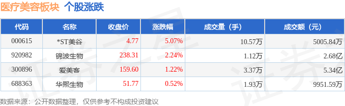 证券之星消息,11月13日医疗美容板块较上一交易日上涨1.15%,*ST美谷领涨。当日上证指数报收于 4029.5,上涨0.73%。深证成指报收于13476.52,上涨1.78%。医疗美容板块个股涨跌见下表: 从资金流向上来看,当日医疗美容板块主力资金净流出4845.5万元,游资资金净流入2745.55万元,散户 资金净流入2099.95万元。医疗美容板块个股资金流向见下表: | 代码 | | | 名称 主力净流入(元) 主力净占比 游资净点比 散户净流入(元) 散户净占比 | | | | | --- | --- | --- | --- | --- | --- | --- | | 000615 *ST美谷 | -38.48万 | -0.77% | -75.31万 | -1.50% | 113.79万 | 2.27% | | 688363 华熙生物 | -1508.17万 | -15.16% | 121.56万 | 1.22% | 1386.61万 | 13.93% | | 300896 爱美客 | -3298.85万 | -6.17% | 2699.30万 | 5.05% | 599.55万 | 1.12% ...