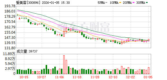 爱美客今年以来股价涨2.03%,近5个交易日涨0.77%,近20日涨2.98%,近60日跌19.85%。 1月5日,爱美客盘中上涨2.03%,截至13:07,报144.60元/股,成交3.75亿元,换手率1.25%,总市值 437.55亿元。 资金流向方面,主力资金净流入461.07万元,特大单买入3451.55万元,占比9.21%,卖出2843.66万元, 占比7.59%;大单买入1.06亿元,占比28.36%,卖出1.08亿元,占比28.75%。 资料显示,爱美客技术发展股份有限公司位于北京市朝阳区建国路甲92号世茂大厦C座21层,成立日期 2004年6月9日,上市日期2020年9月28日,公司主营业务涉及从事生物医用软组织修复材料的研发、生 产和销售。主营业务收入构成为:溶液类注射产品57.27%,凝胶类注射产品37.97%,其他3.01%,冻干 粉类注射产品1.50%,面部埋植线0.26%。 爱美客所属申万行业为:美容护理-医疗美容-医美耗材。所属概念板块包括:合成生物、多肽药、医疗 器械、化妆品、中盘等。 截至12月19日,爱美客股东户数6.17万,较上期增加2.23%;人均流通股3378股,较上期 ...