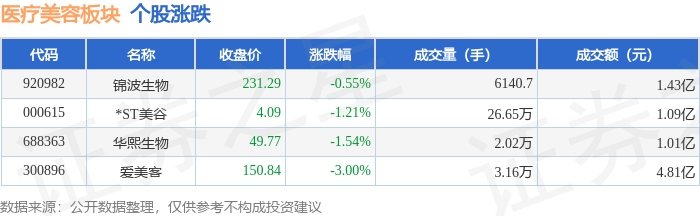 证券之星消息,11月20日医疗美容板块较上一交易日下跌2.32%,爱美客领跌。当日上证指数报收于 3931.05,下跌0.4%。深证成指报收于12980.82,下跌0.76%。医疗美容板块个股涨跌见下表: | 代码 | 名称 | 收盘价 | 涨跌幅 | 成交量(手) | 成交额(元) | | | --- | --- | --- | --- | --- | --- | --- | | 920982 | 锦波生物 | 231.29 | -0.55% | 6140.7 | | 1.43 Z | | 000615 | *ST美谷 | 4.09 | -1.21% | 26.65万 | | 1.09亿 | | 688363 | 华熙生物 | 49.77 | -1.54% | 2.02万 | | 1.01亿 | | 300896 | 爱美客 | 150.84 | -3.00% | 3.16万 | | 4.81亿 | 从资金流向上来看,当日医疗美容板块主力资金净流出1.04亿元,游资资金净流入1721.0万元,散户资金 净流入8685.88万元。医疗美容板块个股资金流向见下表: | 代码 | 名称 | 主力净流入 (元) | ...