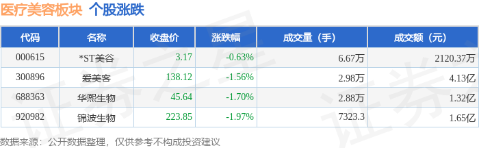 从资金流向上来看,当日医疗美容板块主力资金净流出4981.38万元,游资资金净流出538.33万元,散户 资金净流入5519.71万元。医疗美容板块个股资金流向见下表: | 代码 | 名称 | 收盘价 | 涨跌幅 | 成交量(手) | | 成交额(元) | | | --- | --- | --- | --- | --- | --- | --- | --- | | 000615 | *ST美谷 | 3.17 | -0.63% | | 6.67万 | | 2120.37万 | | 300896 | 爱美客 | 138.12 | -1.56% | | 2.98万 | | 4.13亿 | | 688363 | 华熙生物 | 45.64 | -1.70% | | 2.88万 | | 1.32亿 | | 920982 | 锦波生物 | 223.85 | -1.97% | | 7323.3 | | 1.65亿 | | 代码 | 名称 | | | 主力净流入(元) 主力净占比 游资净流入(元) 游资净占比 散户净流入 (元) 散户净占比 | | | | | --- | --- | --- | --- | --- | --- ...