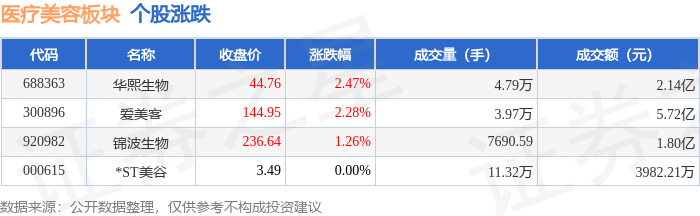 从资金流向上来看,当日医疗美容板块主力资金净流出7417.96万元,游资资金净流入4452.13万元,散户 资金净流入2965.84万元。医疗美容板块个股资金流向见下表: | 代码 | 名称 | | | 主力净流入(元) 主力净占比 游资净流入(元) 游资净占比 散户净流入(元) 散户净占比 | | | | | --- | --- | --- | --- | --- | --- | --- | --- | | 000615 *ST美谷 | | 105.57万 | 41.13% | -56.92万 | -22.18% | -48.65万 | -18.96% | | 688363 华熙生物 | | -37.49万 | -0.38% | 703.25万 | 7.05% | -665.76万 | -6.67% | | 920982 锦波生物 | | -2340.27万 | -12.47% | -1744.60万 | -9.29% | -285.65万 | -1.52% | | 300896 | 爱美客 | -7486.05万 | -20.24% | 3805.80万 | 10.29% | 3680.25万 | 9.9 ...