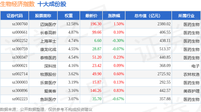 证券之星消息,11月27日,生物经济(970038)指数报收于2134.66点,跌0.06%,成交130.45亿元,换 手率0.95%。当日该指数成份股中,上涨的有22家,华兰疫苗以2.57%的涨幅领涨,下跌的有27家,京新 药业以5.97%的跌幅领跌。 | 代码 | 名称 | 主力净流入(元) | 主力净占比 游资净流入 (元) | | 游资净占比 散户净流入 (元) | | 散户净占比 | | --- | --- | --- | --- | --- | --- | --- | --- | | 002714 | 牧原股份 | 1.04亿 ﮯ | 9.06% | -6278.30万 | -5.46% | -4136.70万 | -3.60% | | 300896 | 爱美客 | 4699.18万 | 11.04% | -1692.30万 | -3.98% | -3006.88万 | -7.07% | | 300760 迈瑞医疗 | | 3307.61万 | 2.35% | -1596.63万 | -1.14% | -1710.98万 | -1.22% | | 000021 | 深科技 | 2671.49万 | ...