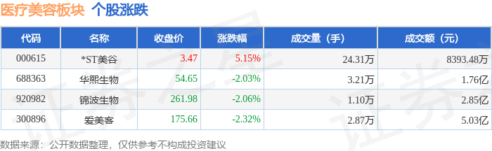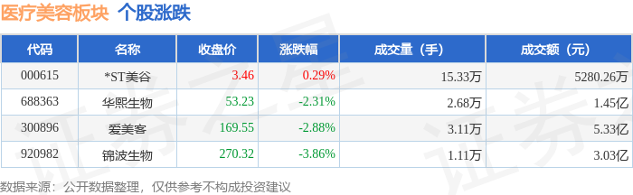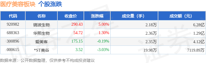 从资金流向上来看,当日医疗美容板块主力资金净流出7569.93万元,游资资金净流入2739.55万元,散户 资金净流入4830.38万元。医疗美容板块个股资金流向见下表: 证券之星消息,10月13日医疗美容板块较上一交易日下跌1.92%,爱美客领跌。当日上证指数报收于 3889.5,下跌0.19%。深证成指报收于13231.47,下跌0.93%。医疗美容板块个股涨跌见下表: | 代码 | 名称 | 收盘价 | 涨跌幅 | 成交量(手) | 成交额(元) | | --- | --- | --- | --- | --- | --- | | 000615 | *ST美谷 | 3.47 | 5.15% | 24.31万 | 8393.48万 | | 688363 | 华熙生物 | 54.65 | -2.03% | 3.21万 | 1.76 Z | | 920982 | 锦波生物 | 261.98 | -2.06% | 1.10万 | 2.85 乙 | | 300896 | 爱美客 | 175.66 | -2.32% | 2.87万 | 5.03亿 | | 代码 | | | 名称 | | | | | --- | --- ...