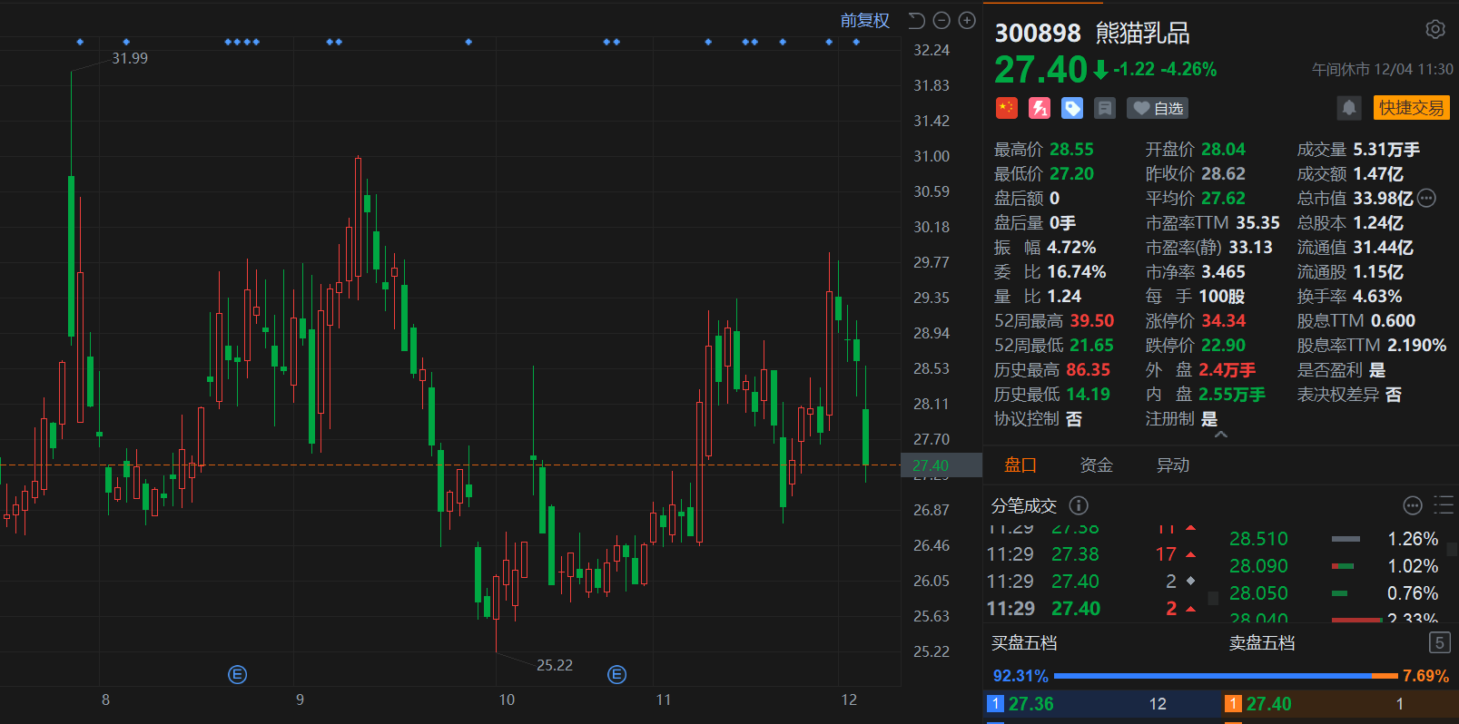 A股异动丨连续遭股东减持,熊猫乳品午间收跌超4%
