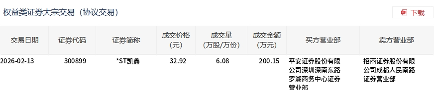 Group 1 - The core point of the news is that *ST Kaixin executed a block trade on February 13, with a total volume of 60,800 shares and a transaction value of 2.0015 million yuan, representing 13.15% of the total trading volume for that day [1][2] - The transaction price was 32.92 yuan per share, which is a discount of 4.02% compared to the market closing price of 34.3 yuan [1][2] - The buyer of the shares was Ping An Securities, while the seller was China Merchants Securities [2]