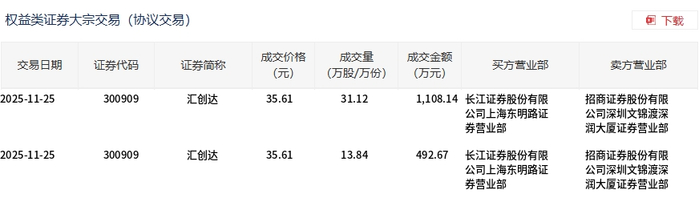 11月25日,汇创达大宗交易成交44.96万股,成交额1600.81万元,占当日总成交额的10.68%,成交价 35.61元,较市场收盘价41.99元折价15.19%。 ...