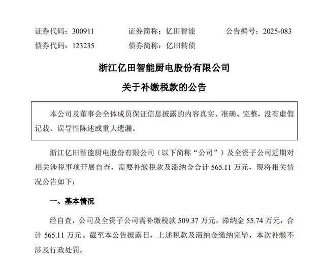 根据《企业会计准则第 28 号——会计政策、会计估计变更和差错更正》相 关规定,上述补缴税款及滞纳金事项不属于前期会计差错,不涉及前期财务数据 追溯调整。公司及全资子公司补缴上述税款及滞纳金将计入 2025 年当期损益, 对公司 2025 年度归属于上市公司股东的净利润的影响,最终以 2025 年度经审计 的财务报表为准。敬请广大投资者注意投资风险。 | 证券代码:300911 | 证券简称:亿田智能 | 公告编号:2025-083 | | --- | --- | --- | | 债券代码:123235 | 债券简称:亿田转债 | | 特此公告。 浙江亿田智能厨电股份有限公司 关于补缴税款的公告 本公司及董事会全体成员保证信息披露的内容真实、准确、完整,没有虚假 记载、误导性陈述或重大遗漏。 浙江亿田智能厨电股份有限公司(以下简称"公司")及全资子公司近期对 相关涉税事项开展自查,需要补缴税款及滞纳金合计 565.11 万元,现将相关情 况公告如下: 一、基本情况 经自查,公司及全资子公司需补缴税款 509.37 万元,滞纳金 55.74 万元,合 计 565.11 万元。截至本公告披露日,上述税款及滞纳金缴 ...