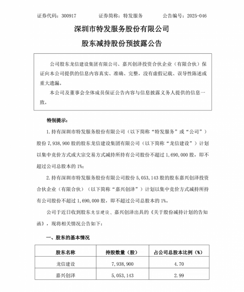 10月21日晚,深圳国资系上市公司特发服务(300917.SZ)发布股东减持预披露公告,公司股东龙信建设集团有限 公司(下称"龙信建设")与嘉兴创泽投资合伙企业(有限合伙)(下称"嘉兴创泽")计划在未来3个月内合计减持 不超过338万股,占公司总股本的比例达2%,减持目的均为股东自身资金规划。 两大股东将减持不超过338万股,合计市值约1.45亿元 根据公告披露的核心信息,龙信建设目前持有特发服务约794万股股份,计划通过集中竞价或大宗交易方式减持不 超过169万股,占公司总股本的1%;嘉兴创泽持有约505万股股份,拟通过集中竞价方式减持不超过169万股,同 样占总股本的1%。截至减持计划披露日,两家股东合计持有特发服务1299.20万股股份,占公司总股本的7.69%, 均非公司控股股东或实际控制人。 从减持方式来看,龙信建设可选择集中竞价或大宗交易两种方式,而嘉兴创泽仅采用集中竞价方式。按照监管规 定,采用集中竞价交易方式的,减持期间为公告披露之日起15个交易日后的3个月内;采用大宗交易方式的,减持 期间为公告披露之日起3个交易日后的3个月内。 以10月21日42.93元/股的收盘价计算,两大股东此次拟减持 ...