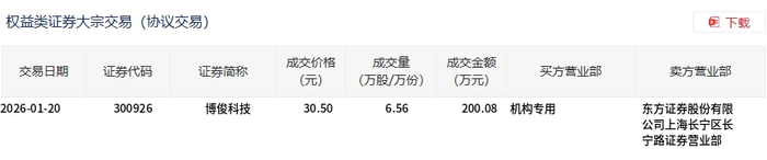 | 权益类证券大宗交易(协议交易) | | | | | | | 团 下载 | | --- | --- | --- | --- | --- | --- | --- | --- | | 交易日期 | 证券代码 | 证券简称 | 成交价格 (元) | 成交量 (万股/万份) | 成交金额 (万元) | 买方营业部 | 卖方营业部 | | 2026-01-20 | 300926 | 博俊科技 | 30.50 | 6.56 | 200.08 机构专用 | | 东方证券股份有限 | | | | | | | | | 公司上海长宁区长 | | | | | | | | | 宁路证券营业部 | 1月20日,博俊科技大宗交易成交6.56万股,成交额200.08万元,占当日总成交额的0.95%,成交价30.5 元,较市场收盘价32.15元折价5.13%。 ...