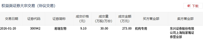 | 权益类证券大宗交易(协议交易) | | | | | | | | 团 下载 | | --- | --- | --- | --- | --- | --- | --- | --- | --- | | 交易日期 | 证券代码 | 证券简称 | 成交价格 (元) | 成交量 (万股/万份) | 成交金额 (万元) | 买方营业部 | 卖方营业部 | | | 2026-01-20 | 300942 | 易瑞生物 | 9.10 | 30.00 | 273.00 机构专用 | | 东兴证券股份有限 | | | | | | | | | | 公司上海陆家嘴证 | | | | | | | | | | 券营业部 | | 1月20日,易瑞生物大宗交易成交30万股,成交额273万元,占当日总成交额的3.74%,成交价9.1元,较 市场收盘价10.1元折价9.9%。 ...
