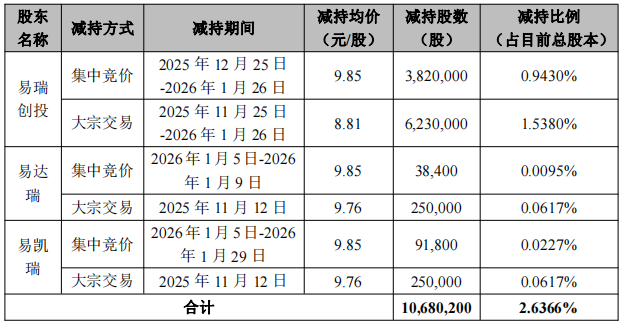 易瑞生物:控股股东及一致行动人合计减持2.6366%