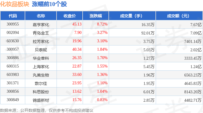 证券之星消息,1月5日化妆品板块较上一交易日上涨1.27%,嘉亨家化领涨。当日上证指数报收于 4023.42,上涨1.38%。深证成指报收于13828.63,上涨2.24%。化妆品板块个股涨跌见下表: | 代码 | 名称 | 主力净流入(元) | 主力净占比 游资净流入 (元) | | 游资净占比 散户净流入(元) | | 散户净占比 | | --- | --- | --- | --- | --- | --- | --- | --- | | 300955 嘉亨家化 | | -2016.87万 | 2.63% | 1166.11万 | 1.52% | -3182.98万 | -4.15% | | 300132 青松股份 | | 861.02万 | 3.98% | 632.95万 | 2.93% | -1493.97万 | -6.91% | | 603630 拉芳家化 | | 852.36万 | 11.52% | -650.13万 | -8.78% | -202.24万 | -2.73% | | 300849 | 锦盛新材 | 542.75万 | 12.11% | -163.79万 | -3.65% | -378 ...