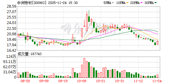 分红方面,中洲特材A股上市后累计派现9075.60万元。近三年,累计派现5475.60万元。 11月21日,中洲特材跌4.43%,成交额2.50亿元。两融数据显示,当日中洲特材获融资买入额1484.84万 元,融资偿还2097.03万元,融资净买入-612.19万元。截至11月21日,中洲特材融资融券余额合计2.77 亿元。 资料显示,上海中洲特种合金材料股份有限公司位于上海市嘉定工业区世盛路580号,成立日期2002年7 月8日,上市日期2021年4月9日,公司主营业务涉及高温耐蚀合金材料及制品的研发、生产和销售,包括 铸造高温耐蚀合金、变形高温耐蚀合金、特种合金焊材等,并可为客户提供预保护或修复性的特种合金 材料表面堆焊服务、精密机械加工服务。主营业务收入构成为:变形高温耐蚀合金53.06%,铸造高温 耐蚀合金27.20%,特种合金焊材17.42%,其他(补充)1.24%,表面堆焊服务0.77%,特种合金焊材贸易 0.31%。 截至11月20日,中洲特材股东户数5.07万,较上期减少7.64%;人均流通股5494股,较上期增加8.27%。 2025年1月-9月,中洲特材实现营业收入6.88亿元,同比减少1 ...
