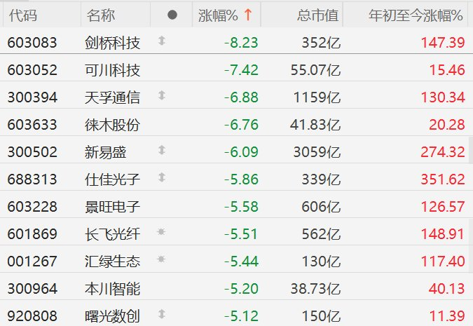 | 代码 | 名称 | | 涨幅% ↑ | 总市值 | 年初至今涨幅%。 | | --- | --- | --- | --- | --- | --- | | 603083 | 剑桥科技 | 1 | -8.23 | 352亿 | 147.39 | | 603052 | 可川科技 | | -7.42 | 55.07亿 | 15.46 | | 300394 | 天孚通信 | - | -6.88 | 1159亿 | 130.34 | | 603633 | 徕木股份 | | -6.76 | 41.83亿 | 20.28 | | 300502 | 新易盛 | 1 | -6.09 | 3059亿 | 274.32 | | 688313 | 仕佳光子 | ﮨ | -5.86 | 339亿 | 351.62 | | 603228 | 景旺电子 | | -5.58 | 606亿 | 126.57 | | 601869 | 长飞光纤 | 婆 | -5.51 | 562亿 | 148.91 | | 001267 | 汇绿牛态 **** | | -5.44 | 130亿 | 117.40 | | 300964 | 本川智能 | | - ...