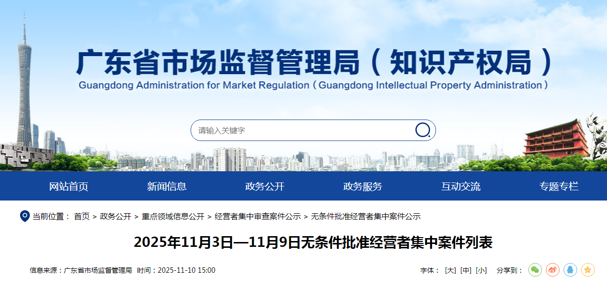 2025年11月3日—11月9日无条件批准经营者集中案件列表