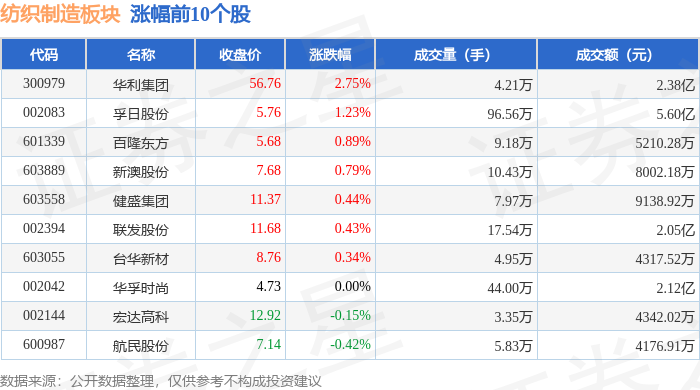 证券之星消息,10月30日纺织制造板块较上一交易日上涨0.13%,华利集团领涨。当日上证指数报收于 3986.9,下跌0.73%。深证成指报收于13532.13,下跌1.16%。纺织制造板块个股涨跌见下表: | 代码 | 名称 | 收盘价 | 涨跌幅 | 成交量(手) | 成交额(元) | | --- | --- | --- | --- | --- | --- | | 300979 | 华利集团 | 56.76 | 2.75% | 4.21万 | 2.38亿 | | 002083 | 幸日股份 | 5.76 | 1.23% | 96.56万 | 5.60亿 | | 665109 | 百隆东方 | 5.68 | 0.89% | 9.18万 | 5210.28万 | | 603889 | 新澳股份 | 7.68 | 0.79% | 10.43万 | 8002.18万 | | 603558 | 健盛集团 | 11.37 | 0.44% | 7.97万 | 9138.92万 | | 002394 | 联发股份 | 11.68 | 0.43% | 17.54万 | 2.05亿 | | 603055 | 台华新材 | 8 ...