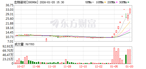 近半年该股累计上榜龙虎榜7次,上榜次日股价平均涨14.39%,上榜后5日平均涨64.09%。 资金流向方面,今日该股主力资金净流入215.22万元,其中,特大单净流入507.42万元,大单资金净流 出292.20万元。近5日主力资金净流出1.66亿元。 融资融券数据显示,该股最新(1月19日)两融余额为4.09亿元,其中,融资余额为4.09亿元,融券余额 为42.60万元。近5日融资余额合计增加5837.14万元,增幅为16.65%,融券余额合计减少6.80万元,降幅 13.77%。(数据宝) 证券时报·数据宝统计显示,上榜的前五大买卖营业部合计成交2.71亿元,其中,买入成交额为1.31亿 元,卖出成交额为1.40亿元,合计净卖出902.66万元。 具体来看,今日上榜的营业部中,共有3家机构专用席位现身,即买三、卖一、卖四,合计买入金额 2770.82万元,卖出金额4850.36万元,合计净卖出2079.54万元,深股通为第一大买入营业部,买入金额 为4062.00万元,卖出金额为1329.91万元,合计净买入2732.09万元。 志特新材1月20日交易公开信息 志特新材今日上涨19.01%,全天换手率18 ...