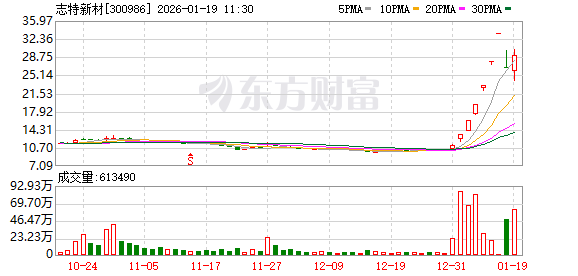 (文章来源:证券时报网) 数据宝统计,截至10:54,志特新材成交额15.09亿元,创上市以来新高。最新股价上涨10.49%,换手率 13.76%。上一交易日该股全天成交额为13.48亿元。 据天眼查APP显示,江西志特新材料股份有限公司成立于2011年12月08日,注册资本41197.3975万人民 币。(数据宝) ...