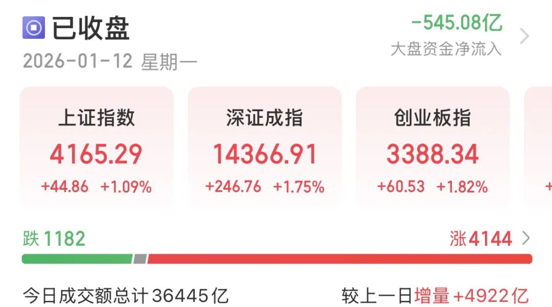 1月12日,A股成交爆量,日成交额飙至3.65万亿元,逾4000只个股收红,201只涨停;传媒、计算机、军工、机械板块掀起涨停潮,多只卫星ETF封板。 受访人士指出,巨量成交释放增量资金加速入场的强烈信号,但需警惕短线波动加剧——天量之后往往伴随获利回吐,且量能能否持续仍待观察。预计本 周A股延续震荡上行,波动幅度或将进一步扩大。 4144只个股上涨 又是情绪高涨的一天! A股量价齐升,成交额较上一交易日放大近5000亿元,暴增至3.65万亿元。指数全线飘红:沪指收涨1.09%报4165.29点,创业板指收涨1.82%报3388.34 点,深证成指收涨1.75%。沪深300、上证50微红,科创50收涨2.43%,北证50涨逾5%。 盘面上,计算机软件、营销服务、AI智能体、智谱AI、卫星应用等板块大涨,但PCB、麒麟电池、动力电池回收、石油天然气、煤炭、化学原料均走弱。 除了石油石化、煤炭、房地产微跌,其余28个申万一级行业均收红,传媒、计算机板块涨幅均超过7%。国防军工、社会服务、通信、商贸零售、钢铁、 机械设备也都表现不错。 | 名称 | . | 涨幅% ↓ | 涨停家数 | 跌停家数 | 成交额 | 年 ...