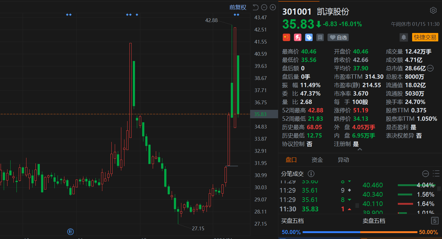 Core Viewpoint - The stock of Kaichun Co., Ltd. (301001.SZ) experienced significant volatility, with a 16% drop following a previous 20% increase, indicating a rollercoaster market behavior [1] Company Summary - Kaichun Co., Ltd. reported a current stock price of 36.8 yuan, with a total market capitalization falling below 3 billion yuan [1] - The company announced that its stock price had deviated significantly, with a cumulative increase of over 30% in closing prices over three consecutive trading days, classifying it as an abnormal trading fluctuation [1] - After verification, the company confirmed that there were no significant changes in its operational situation or external business environment, and no undisclosed major matters related to the company by its controlling shareholders [1] - The controlling shareholder, Wang Li, along with co-actor Xu Lei, plans to reduce their holdings by no more than 2% of the company's shares [1]