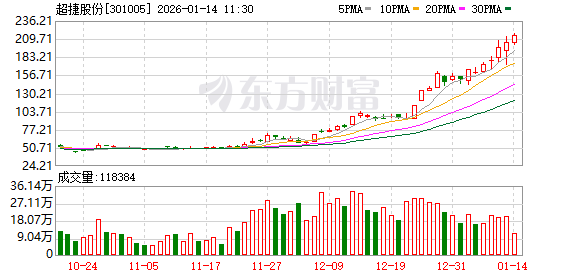 两融数据显示,该股最新(1月13日)两融余额为10.04亿元,其中,融资余额为10.03亿元,近10日增加 4.51亿元,环比增长81.63%。 公司发布的三季报数据显示,前三季度公司共实现营业收入6.02亿元,同比增长34.49%,实现净利润 2842.84万元,同比增长11.52%,基本每股收益为0.2100元,加权平均净资产收益率3.74%。(数据宝) (文章来源:证券时报网) 超捷股份股价再创历史新高,该股近期呈不断突破新高之势,近一个月累计有12个交易日股价刷新历史 纪录。截至10:52,该股目前上涨4.40%,股价报214.00元,成交1072.16万股,成交金额22.39亿元,换 手率8.10%,该股最新A股总市值达287.32亿元,该股A股流通市值283.27亿元。 证券时报·数据宝统计显示,超捷股份所属的汽车行业,目前整体涨幅为0.68%,行业内,目前股价上涨 的有244只,涨停的有山子高科、新泉股份等3只。股价下跌的有55只,跌幅居前的有跃岭股份、春风动 力、潍柴重机等,跌幅分别为9.86%、3.50%、2.88%。 ...