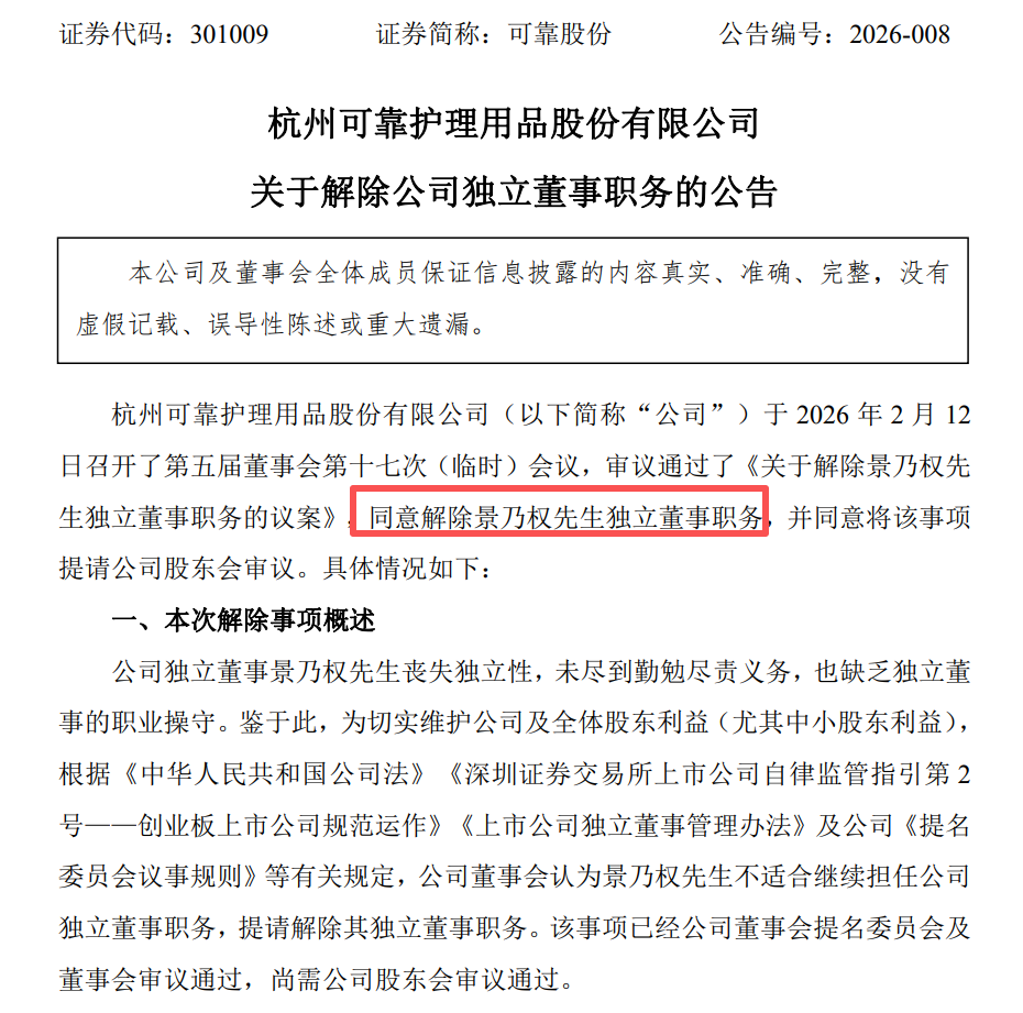 证券代码:301009 证券简称:可靠股份 公告编号:2026-008 杭州可靠护理用品股份有限公司 关于解除公司独立董事职务的公告 本公司及董事会全体成员保证信息披露的内容真实、准确、完整,没有 虚假记载、误导性陈述或重大遗漏。 杭州可靠护理用品股份有限公司(以下简称"公司")于 2026 年 2 月 12 日召开了第五届董事会第十七次(临时)会议,审议通过了《关于解除景乃权先 生独立董事职务的议案》,同意解除景乃权先生独立董事职务,并同意将该事项 提请公司股东会审议。具体情况如下: 一、本次解除事项概述 公司独立董事景乃权先生丧失独立性,未尽到勤勉尽责义务,也缺乏独立董 事的职业操守。鉴于此,为切实维护公司及全体股东利益(尤其中小股东利益), 根据《中华人民共和国公司法》《深圳证券交易所上市公司自律监管指引第 2 号——创业板上市公司规范运作》《上市公司独立董事管理办法》及公司《提名 委员会议事规则》等有关规定,公司董事会认为景乃权先生不适合继续担任公司 独立董事职务,提请解除其独立董事职务。该事项已经公司董事会提名委员会及 董事会审议通过,尚需公司股东会审议通过。 3、深交所要求的其他报备文件。 特此公 ...