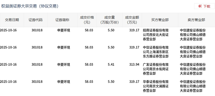 Core Insights - On October 16, 2025, Shenling Environment executed a block trade of 219,100 shares, amounting to 12.7145 million yuan, which represented 3.31% of the total trading volume for the day [1].   Trading Details - The transaction price was 58.03 yuan per share, reflecting an 11% discount compared to the market closing price of 65.20 yuan [1]. - The trading volume for the day was 5.50 million shares, with the total transaction value being 319.17 million yuan from various brokerage firms [2]. - Multiple brokerage firms were involved in the transactions, including招商证券, 中信证券, and 广发证券, indicating a diverse trading interest [2].