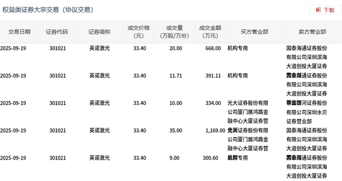 Group 1 - On September 19, Inno Laser executed a block trade of 857,100 shares, with a transaction amount of 28.6271 million yuan, accounting for 4.9% of the total trading volume for the day [1] - The transaction price was 33.4 yuan, representing an 18.3% discount compared to the market closing price of 40.88 yuan [1] Group 2 - The block trade included multiple transactions with various institutional buyers, with the largest single transaction being 350,000 shares for a total of 11.69 million yuan [2] - Other notable transactions included 200,000 shares at the same price, totaling 6.668 million yuan, and 100,000 shares for 3.34 million yuan [2]