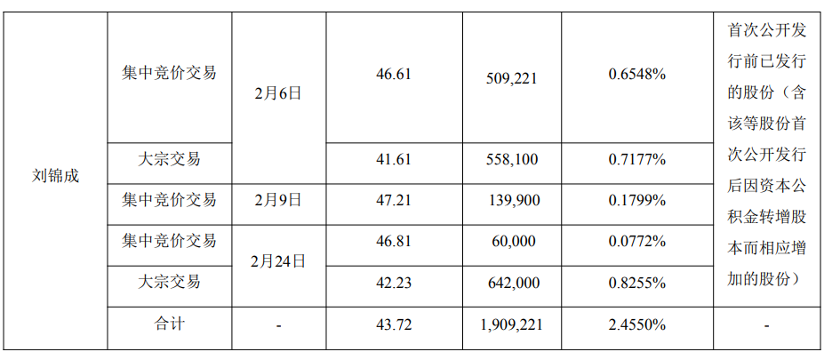 格隆汇2月25日丨奕帆传动(301023.SZ)公布,公司于近日收到刘锦成先生出具的《关于股份减持实施进 展的告知函》,刘锦成先生已通过二级市场累计减持公司股份190.9万股,占扣除公司回购股份数后的 总股本比例的2.4550%。本次减持计划尚未实施完毕。 ...