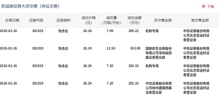 2月26日,怡合达大宗交易成交33.99万股,成交额959.88万元,占当日总成交额的1.88%,成交价28.24 元,较市场收盘价30.37元折价7.01%。 | 交易日期 | 证券代码 | 证券简称 | 成交价格 | 成交量 | 成交全额 | 买方营业部 | 卖方营业部 | | --- | --- | --- | --- | --- | --- | --- | --- | | | | | (元) | (万股/万份) | (万元) | | | | 2026-02-26 | 301029 | 怡合达 | 28.24 | 7.09 | 200.22 | 机构专用 | 中信证券股份有限 | | | | | | | | | 公司北京亚运村证 | | | | | | | | | 券营业部 | | 2026-02-26 | 301029 | 怡合达 | 28.24 | 12.50 | 353.00 | 国联民生证券股份 | 中信证券股份有限 | | | | | | | | 有限公司深圳益田 | 公司北京亚运村证 | | | | | | | | 路证券营业部 | 劳营业部 | | 2026-02-26 | 301029 ...