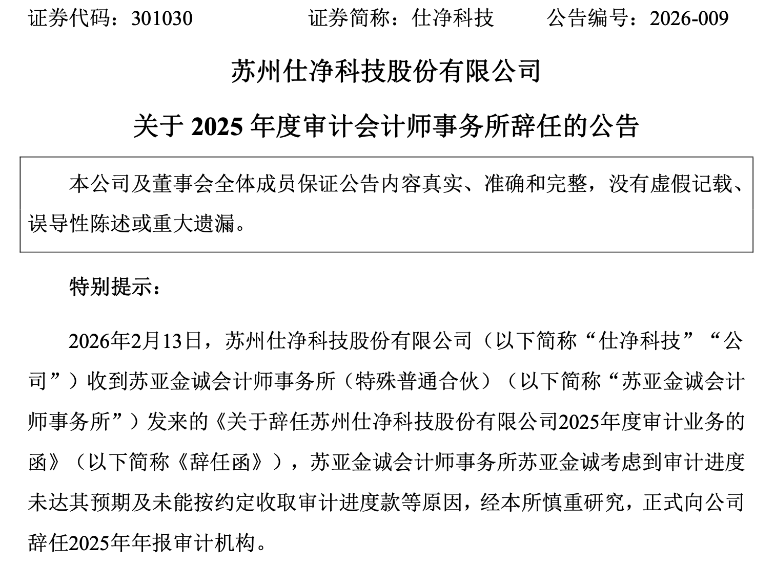 特别提示: 2026年2月13日,苏州仕净科技股份有限公司(以下简称"仕净科技""公 司")收到苏亚金诚会计师事务所(特殊普通合伙)(以下简称"苏亚金诚会计 师事务所")发来的《关于辞任苏州仕净科技股份有限公司2025年度审计业务的 函》(以下简称《辞任函》),苏亚金诚会计师事务所苏亚金诚考虑到审计进度 未达其预期及未能按约定收取审计进度款等原因,经本所慎重研究,正式向公司 辞任2025年年报审计机构。 证券代码:301030 证券简称:仕净科技 公告编号:2026-009 苏州仕净科技股份有限公司 关于 2025 年度审计会计师事务所辞任的公告 本公司及董事会全体成员保证公告内容真实、准确和完整,没有虚假记载、 误导性陈述或重大遗漏。 一、会计师事务所辞任的概述 公司于2025年12月31日召开了第四届董事会第十二次会议,审议通过了《关 于拟变更会计师事务所的议案》,具体内容详见公司于2025年12月31日披露于巨 潮资讯网(www.cninfo.com.cn)的《关于拟变更会计师事务所的公告》。(公 告编号:2025-072)。2026年1月19日,公司召开2026年第一次临时股东会,审 议通过了《关于拟 ...