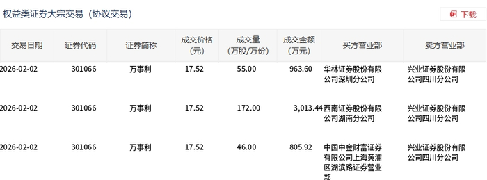 2月2日,万事利大宗交易成交273万股,成交额4782.96万元,占当日总成交额的10.01%,成交价17.52 元,较市场收盘价17.52元持平。 | 权益类业券大宗父易(协议交易) | | | | | | | 包 下载 | | --- | --- | --- | --- | --- | --- | --- | --- | | 交易日期 | 证券代码 | 证券简称 | 成交价格 | 成交量 | 成交全额 | 买方营业部 | 卖方营业部 | | | | | (元) | (万股/万份) | (万元) | | | | 2026-02-02 | 301066 | 万事利 | 17.52 | 55.00 | 963.60 | 华林证券股份有限 | 兴业证券股份有限 | | | | | | | | 公司深圳分公司 | 公司四川分公司 | | 2026-02-02 | 301066 | 万事利 | 17.52 | 172.00 | | 3,013.44西南证券股份有限 | 兴业证券股份有限 | | | | | | | | 公司湖南分公司 | 公司四川分公司 | | 2026-02-02 | 301066 | 万事利 | ...