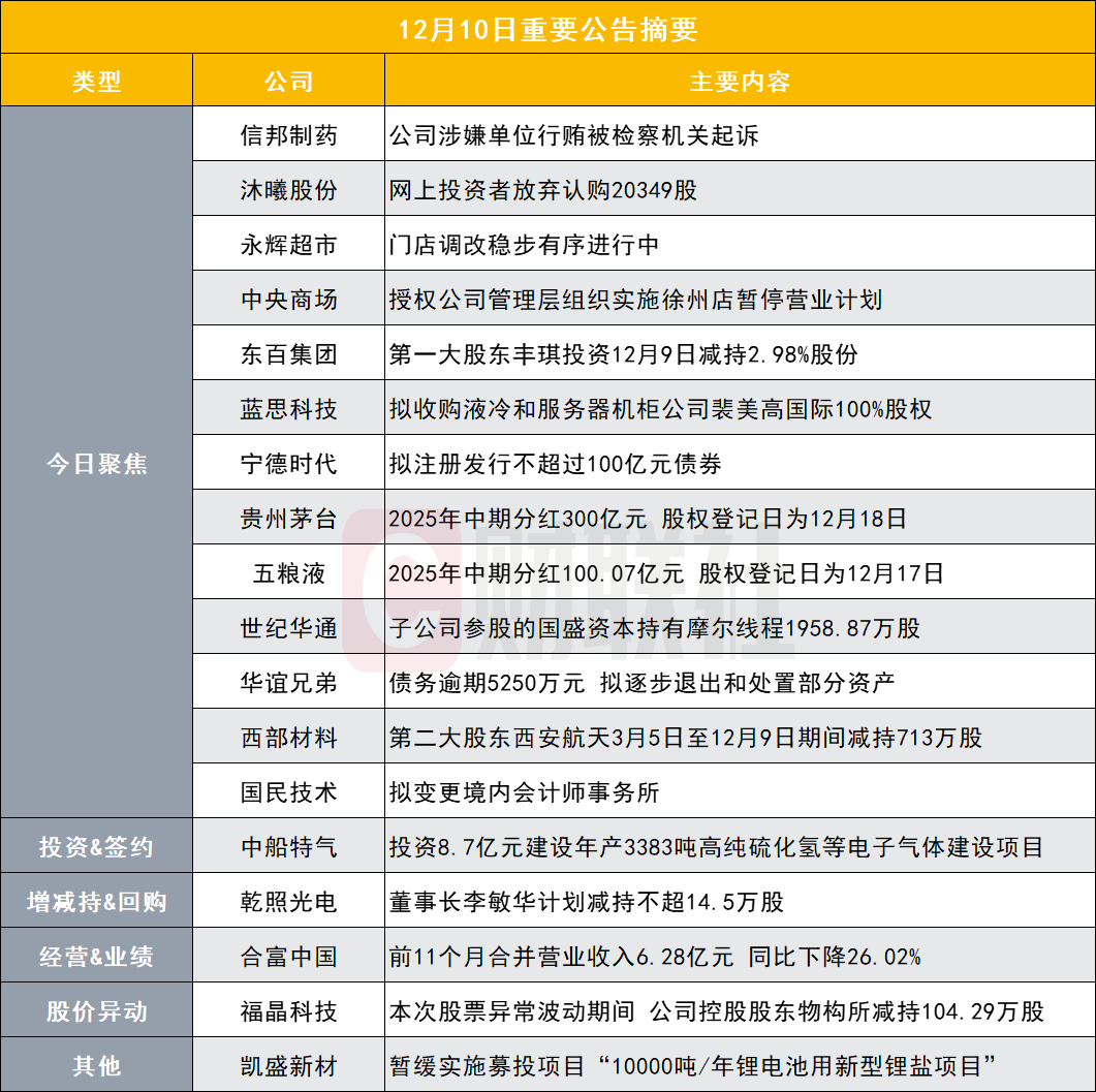 Company News - Xinfeng Pharmaceutical is facing prosecution for alleged unit bribery, which may negatively impact its brand reputation and business development [2] - Muxi Co. reported that online investors abandoned the subscription of 20,349 shares, with a total value of approximately 2.13 million yuan [3] - Yonghui Supermarket is undergoing orderly store adjustments, with normal business operations [4] - Central Plaza has authorized management to implement a plan to suspend operations at its Xuzhou store due to ongoing operational difficulties [5] - Dongbai Group's largest shareholder reduced its stake by 2.98% on December 9 [6] - Lens Technology plans to acquire 100% of PMG International to enhance its capabilities in AI computing infrastructure [6] - CATL intends to register and issue bonds not exceeding 10 billion yuan for project construction and working capital [7] - Kweichow Moutai announced a mid-term dividend of 30 billion yuan for 2025, with the record date on December 18 [8] - Wuliangye approved a mid-term dividend of 10.007 billion yuan for 2025, with the record date on December 17 [9] - Century Huatong's subsidiary holds 1,958,870 shares of Moer Thread, which may significantly impact its Q4 net profit [10] - Huayi Brothers reported a debt default of 52.5 million yuan and plans to gradually exit and dispose of some assets [11] - Western Materials' second-largest shareholder reduced its stake by 7.13 million shares from March 5 to December 9 [12] - Guomin Technology plans to change its domestic accounting firm due to regulatory investigations involving its previous auditor [13] Investment & Contracts - China Shipbuilding Special Gas announced an investment of 870 million yuan to build a project for producing high-purity hydrogen sulfide and other electronic gases [14] - Daon Co. plans to acquire 80% of Ningbo Aisikai Synthetic Rubber Co. for 516 million yuan, enhancing its production capabilities [15] - Huasheng Co. intends to purchase 97.4% of AIDC's Yixin Technology for approximately 666 million yuan [16] - Wuhan Tianyuan's subsidiary signed an investment agreement for a total of about 600 million yuan in energy storage projects [17] Shareholding Changes & Buybacks - Qianzhao Optoelectronics' chairman plans to reduce his stake by up to 145,000 shares due to personal financial needs [18] - Zhuangyuan Ranch's major shareholder intends to reduce his stake by up to 3% [19] - Zhili Fang plans to reduce its stake by up to 1.20% [20] - Yingsite's major shareholder plans to reduce its stake by up to 2.22% [21] Operations & Performance - Hefei China reported a consolidated revenue of 628 million yuan for the first 11 months, a decrease of 26.02% year-on-year [22] Contracts & Project Wins - Jicheng Electronics won contracts totaling approximately 215 million yuan from the State Grid [23] Stock Price Fluctuations - Fuzheng Technology's stock experienced abnormal fluctuations, with its controlling shareholder reducing holdings by 1.0429 million shares [24] Other - Kaisheng New Materials has postponed the implementation of its lithium battery project due to market uncertainties [25]