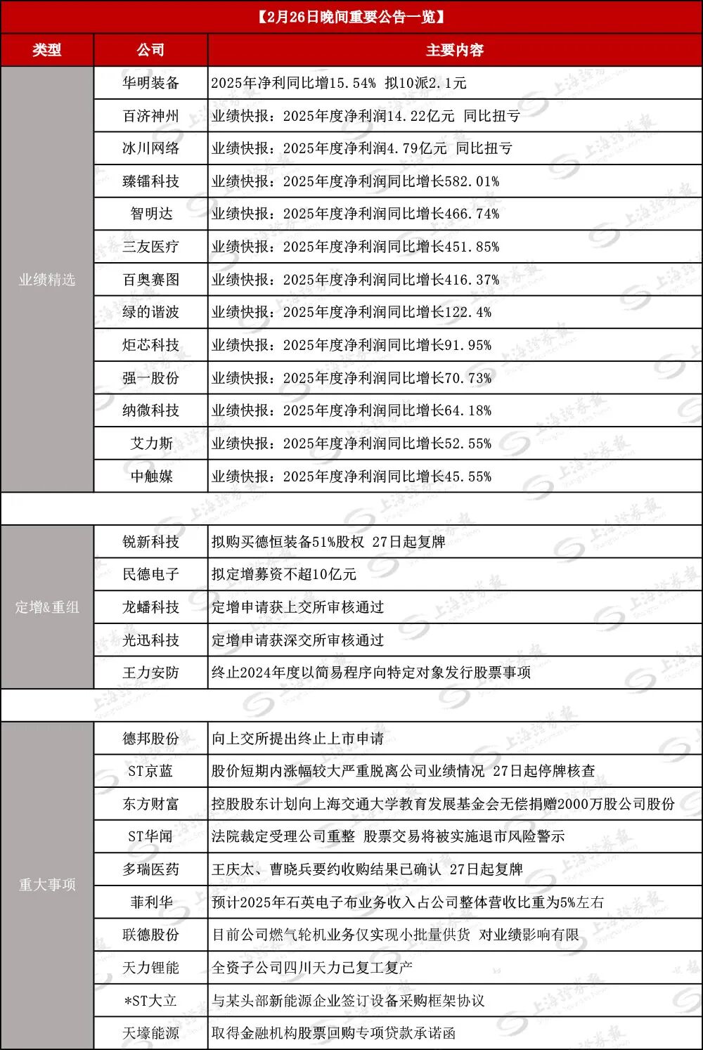 | 类型 | 公司 | 【2月26日晚间重要公告一览】 主要内容 | | --- | --- | --- | | | 华明装备 | 2025年净利同比增15.54% 拟10派2.1元 | | | 自济神州 | 业绩快报:2025年度净利润14. 22亿元 同比扭亏 | | | 冰川网络 | 业绩快报:2025年度净利润4. 79亿元 同比扭亏 | | | 臻锚科技 | 业绩快报:2025年度净利润同比增长582.01% | | | 智明达 | 业绩快报:2025年度净利润同比增长466.74% | | | 三友医疗 | 业绩快报:2025年度净利润同比增长451.85% | | 业绩精选 | 百奥赛图 | 业绩快报:2025年度净利润同比增长416.37% | | | 绿的谐波 | 业绩快报:2025年度净利润同比增长122. 4% | | | 矩芯科技 | 业绩快报:2025年度净利润同比增长91.95% | | | 强一股份 | 业绩快报:2025年度净利润同比增长70.73% | | | 纳微科技 | 业绩快报:2025年度净利润同比增长64.18% | | | 艾力斯 | 业绩快报:2025年度净利润 ...