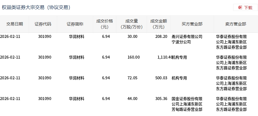 2月11日,华润材料大宗交易成交306.05万股,成交额2123.99万元,占当日总成交额的27.54%,成交价6.94元,较市场收盘 价7.78元折价10.8%。 | 交易日期 | 证券代码 | 证券简称 | 成交价格 | 成交量 | 成交全额 | 买方营业部 | 卖方营业部 | | --- | --- | --- | --- | --- | --- | --- | --- | | | | | (元) | (万股/万份) | (万元) | | | | 2026-02-11 | 301090 | 华润材料 | 6.94 | 30.00 | | 208.20 角兴证券有限公司 | 华泰证券股份有限 | | | | | | | | 宁波分公司 | 公司上海浦东新区 | | | | | | | | | 东方路证券营业部 | | 2026-02-11 | 301090 | 华润材料 | 6.94 | 160.00 | 1,110.4 机构专用 | | 华泰证券股份有限 | | | | | | | | | 公司上海浦东新区 | | | | | | | | | 东方路证券营业部 | | 2026-02-11 | 3010 ...