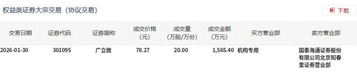 | 权益类证券大宗交易(协议交易) | | | | | | | | 团 下载 | | --- | --- | --- | --- | --- | --- | --- | --- | --- | | 交易日期 | 证券代码 | 证券简称 | 成交价格 (元) | 成交量 (万股/万份) | 成交金额 (万元) | 买方营业部 | 卖方营业部 | | | 2026-01-30 | 301095 | 广立微 | 78.27 | 20.00 | 1,565.40 机构专用 | | 国泰海通证券股份 | | | | | | | | | | 有限公司北京知春 田江关感业城 | | 1月30日,广立微大宗交易成交20万股,成交额1565.4万元,占当日总成交额的3.02%,成交价78.27 元,较市场收盘价78.9元折价0.8%。 ...