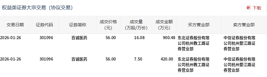 | 交易日期 | 证券代码 | 证券简称 | 成交价格 | 成交量 | 成交全额 | 买方营业部 | 卖方营业部 | | --- | --- | --- | --- | --- | --- | --- | --- | | | | | (元) | (万股/万份) | (万元) | | | | 2026-01-26 | 301096 | 目诚医药 | 56.00 | 16.08 | | 900.48 东北证券股份有限 | 中信证券股份有限 | | | | | | | | 公司杭州教工路证 | 公司杭州婺江路证 | | | | | | | | 券营业部 | 券营业部 | | 2026-01-26 | 301096 | 百诚医药 | 56.00 | 7.50 | | 420.00 东北证券股份有限 | 中信证券股份有限 | | | | | | | | 公司杭州教工路证 | 公司杭州经汇路证 | | | | | | | | 券营业部 | 劳营业部 | 1月26日,百诚医药大宗交易成交23.58万股,成交额1320.48万元,占当日总成交额的6.8%,成交价56元,较市场收盘价 56.03元折价0.05%。 ...