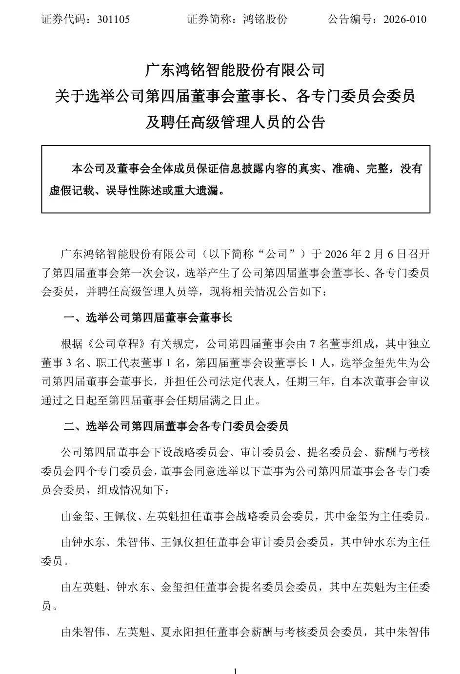 A股新添一名"00后"董事长。 证券代码:301105 证券简称:鸿铭股份 公告编亏: 2026-010 广东鸿铭智能股份有限公司 由金玺、王佩仪、左英魁担任董事会战略委员会委员,其中金玺为主任委员。 关于选举公司第四届董事会董事长、各专门委员会委员 及聘任高级管理人员的公告 本公司及董事会全体成员保证信息披露内容的真实、准确、完整,没有 虚假记载、误导性陈述或重大遗漏。 广东鸿铭智能股份有限公司(以下简称"公司")于2026年2月6日召开 了第四届董事会第一次会议,选举产生了公司第四届董事会董事长、各专门委员 会委员,并聘任高级管理人员等,现将相关情况公告如下: 一、选举公司第四届董事会董事长 根据《公司章程》有关规定,公司第四届董事会由7名董事组成,其中独立 董事 3 名、职工代表董事 1 名,第四届董事会设董事长 1 人,选举金玺先生为公 司第四届董事会董事长,并担任公司法定代表人,任期三年,自本次董事会审议 通过之日起至第四届董事会任期届满之日止。 二、选举公司第四届董事会各专门委员会委员 公司第四届董事会下设战略委员会、审计委员会、提名委员会、薪酬与考核 委员会四个专门委员会,董事会同意选举以下董事 ...