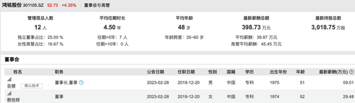 2月6日,鸿铭股份(301105)(301105.SZ)2026年第二次临时股东会召开,完成了公司董事会换届选举,金玺、王佩仪等人顺利当选为公司董事。在同 日进行的公司第四届董事会第一次会议上,金玺当选为董事长,并被聘任为公司总经理。 金玺出生于2000年,年仅26岁。此次当选后,他成为A股仅有的两名"00后"董事长之一。另一人为海南瑞泽(002596)(002596)董事长张灏铿(出生于 2001年)。 另据公开资料显示,金玺是中国国籍,本科毕业于纽约大学机械工程专业,研究生毕业于哥伦比亚大学企业风险管理专业。2022年6月至2022年8月,就职 于鸿铭股份研发部,担任机械装配员;2023年5月至2023年8月,就职于鸿铭股份研发部,担任研发工程师助理;2025年9月起就职于鸿铭国际(香港)有 限公司,担任董事,2025年10月起就职于鸿铭数字科技(香港)有限公司,担任董事,2025年12月起就职于鸿铭股份担任董事长助理。 金玺为金健与蔡铁辉之子,金健与蔡铁辉夫妇是鸿铭股份的控股股东、实际控制人,两人直接持有鸿铭股份超60%股权。金健此前担任鸿铭股份董事长、 总经理。金健1975年出生,蔡铁辉1974年出生 ...