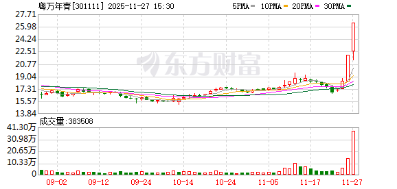 南财智讯11月27日电,粤万年青公告,公司股票在连续3个交易日内(2025年11月25日、2025年11月26 日、2025年11月27日)日收盘价格涨幅偏离值累计超过30%,根据相关规定,属于股票交易异常波动的 情况。针对上述情况,公司董事会对公司、控股股东及实际控制人进行了核实:未发现前期披露信息需 更正或补充;近期未有市场关注度较高的媒体报道;经营情况及内外部环境未发生重大变化;公司、控 股股东和实际控制人不存在应披露而未披露的重大事项,亦无其他处于筹划阶段的重大事项;控股股 东、实际控制人在股票异常波动期间未买卖公司股票。董事会确认,公司目前没有任何应予以披露而未 披露的事项,也未获悉对股票交易价格产生较大影响的信息,前期披露的信息不存在需要更正或补充之 处。 ...